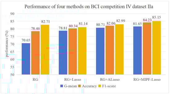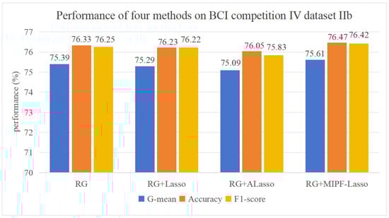 Based on dataset IIb, the influence in classification accuracy and G-mean after adding LASSO and adaptive LASSO to feature selection in the Riemannian geometric framework is shown in Figure 4. The classification accuracy and G-mean of RG LASSO and RG adaptive LASSO were both found in the lower echelons compared to RG. This consequential outcome is attributed to the assumption inherent in adaptive LASSO and LASSO; the assumption leads the feature selection to potentially leave some relevant features out of the consideration []. The complex EEG data, harboring a non-linear relationship among features, disrupt this assumption and cast a discernible impact on feature selection. However, the interactive information is increased into the adaptive LASSO method, and the accuracy, F1-Score, and G-mean soar to 76.47%, 76.42%, and 75.61%, respectively, reaching the apogees in Figure 4. This indirectly indicates the importance of mutual information for feature selection. Furthermore, compared to the corresponding metrics of other methods as illustrated in Figure 4, the accuracy, F1-Score, and G-mean achieved by the proposed method are elevated by 0.14%, 0.17%, and 0.22%, respectively. This substantiates the efficacy and enhanced capabilities of feature classification for the proposed method in comparison to the other methods.