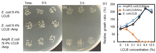 E. coli and AmpR E. coli in 9.4% LCLB broths without or with 100 μg/mL Amp (a) before and (b) after 3-hour culture and spotted on LB agar plates. (c) Relative growth ratios of bacteria counted from the colony number before and after the 3-hour culture in concentration-varied LCLB broths. Each value was calculated from three repetitions.