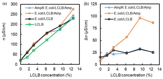 Figure 3b shows the conductivity changes after the 3-hour culture. The result shows that only the conductivity of the E. coli/LCLB/Amp mixtures increased with increasing LCLB concentration, reaching a maximum at 9.4% LCLB, and then slightly decreased at 12.5% LCLB concentration. The phenomenon is similar to the growth ratio seen in Figure 2c. The higher LCLB concentration causes more E. coli proliferation, allowing Amp inhibition to destroy the proliferated E. coli. The increments of conductivities are derived from the cytoplasm leakage due to the E. coli lysis [39].