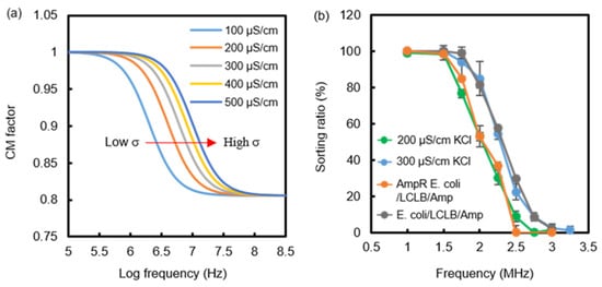 (a) The CM factor spectrum of conductivity-varied (100 to 500 μS/cm) droplets suspended in a fluorinated oil (4.5 nS/cm) calculated by the MyDEP software v1.0.1. (b) The sorting ratios (droplet number sorted into the HFpDEP channel divided by the total droplet number) of different droplets containing 200 μS/cm KCl, 300 μS/cm KCl, E. coli/9.4%LCLB/Amp, and AmpR E. coli/9.4%LCLB/Amp when applying 100 Vpp FpDEP in different frequencies. Each value was calculated from three repetitions in droplet-sorting experiments.