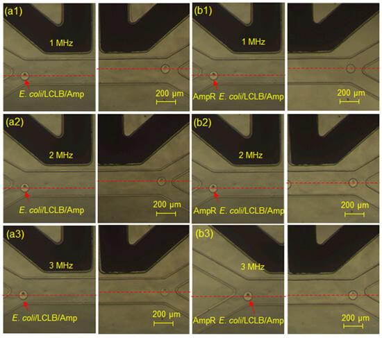 Position images of the (a1–a3) E. coli/LCLB/Amp and the (b1–b3) AmpR E. coli/LCLB/Amp-containing droplets passing through the FpDEP region of 1 (a1,b1), 2 (a2,b2), and 3 (a3,b3) MHz. The red arrows indicate the position of droplets. The red dashed lines indicate the central position of the droplets.