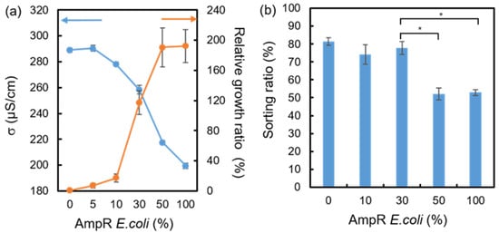 (a) Conductivities (σ, blue line) and relative growth ratios (orange line) obtained from the ratio-varied AmpR E. coli bacterial suspension after the 3-hour culture. (b) The sorting ratio of the mixed bacterial samples after applying 2 MHz and 100 Vpp FpDEP. Each value was calculated from three repetitions. Statistical significance (*) was tested using the Student t-test to indicate p < 0.001.
