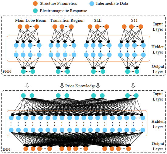 In summary, this research presents a strategy for addressing the challenges of high data requirements and the complexity of defining the optimization target in complex electro-magnetic problem-solving. The method employs a reverse neural network as the core element, supplemented by several forward neural networks to provide preliminary knowledge concerning beam distribution. Furthermore, specific equations or parameters are established to streamline the electromagnetic response of the optimization target. This facilitates the implementation of a multi-index optimization algorithm for an all-dielectric lens antenna and the inversion of antenna structural parameters in scenarios involving pencil beam distribution.
