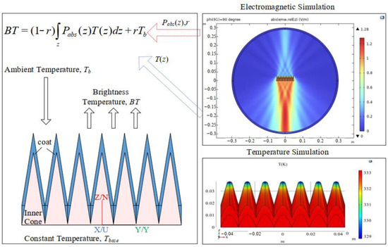 - Wang, J.H.; Yang, Y.J.; Miao, J.G.; Chen, Y.M. Emissivity calculation for a finite circular array of pyramidal absorbers based on Kirchhoff’s Law of thermal radiation. IEEE Trans. Antennas Propag. 2010, 58, 1173–1180. [Google Scholar] [CrossRef]