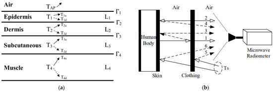 Figure 4. (a) Incoherent model of microwave thermal radiation interaction within human skin tissues; (b) microwave thermal radiation model for the human body surfaces clad in clothing. - (b)