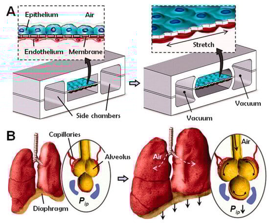 Huh et al.’s lung-on-a-chip. (A) The microfabricated lung device replicates breathing motions through vacuum-induced mechanical stretching of PDMS membranes, forming an alveolar-capillary barrier within the compartmentalized microchannels. (B) Diaphragm contraction lowers intrapleural pressure (Pip), stretching the alveolar-capillary interface during inhalation in living lungs [39].