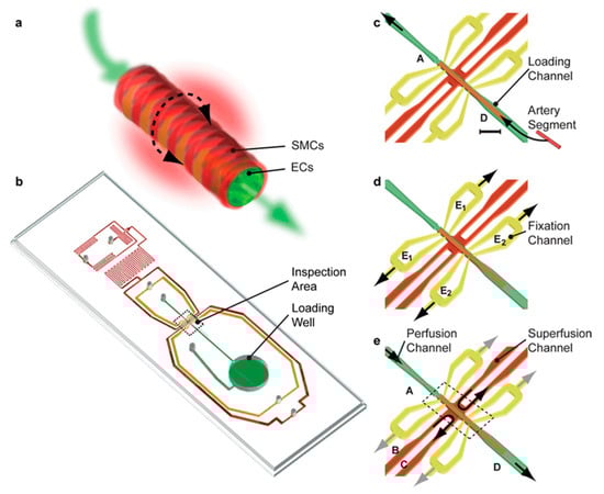 Gunther et al.’s artery-on-a-chip. (a) Illustration of a resistance artery segment. (b) Illustration of the chip housing a network of microchannels, a loading well for arteries, and an inspection area for arteries. (c–e) Illustrations of reversible procedures for artery segment loading, fixation, and inspection [56].