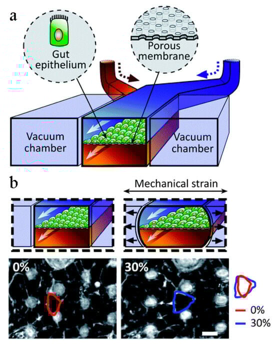Kim et al.’s intestine-on-a-chip. (a) Schematic of a gut-on-a-chip device: flexible ECM-coated membrane with gut epithelial cells spans central microchannel, flanked by full-height vacuum chambers. (b) Images show intestinal monolayers in gut-on-a-chip: with (right) or without mechanical strain (left) (30%; arrow indicated direction); suction applied to vacuum chambers causes cell distortion toward tension direction [44].