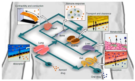 Huh et al. [39] published the first “lung-on-a-chip” article in 2010, introducing the idea of “organ-on-a-chip” as microfluidic in vitro cell culture systems that mimic the physiology of the basic functional units of an organ. A public–private partnership assigned Ingber’s lab to develop ten human organs-on-a-chip two years later. The business has created liver and intestine models in addition to a lung-on-a-chip, according to Hamilton, and is currently working on the next generation, which will include brain, kidney, and skin chips [40]. Organ-on-a-chip technology is growing in popularity for biological research due to the high expectations for reproducing essential elements of the human physiological environment and the ability to replace animal models. Organ-on-a-chip technology could speed up the time it takes for therapeutic compounds to enter clinical trials by reducing the reliance on animal testing, which is now the primary method used to evaluate the kinetics, efficacy, and safety of medication candidates. Also, studying pharmacokinetics in particular persons, i.e., personalized, is possible by cultivating human cells on chips [41].