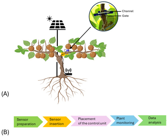 Bioristor system and implementation in kiwifruit. (A) Scheme of the bioristor sensor implemented in a kiwi plant, (B) Flowchart of the bioristor sensor monitoring in kiwifruit.