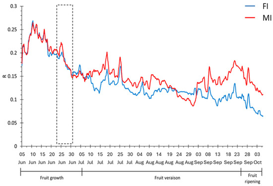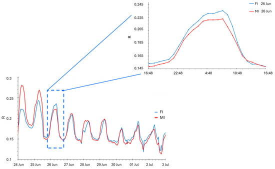 Plot of the daily sensor response during the defoliation period recorded on 26 June 2019. FI: farm irrigation, MI: modified irrigation.