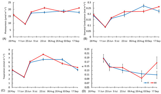 At the end of August, the maximum values of stomatal conductance were observed for FI, while photosynthesis remained stable in both water regimes. At the end of September, a decrease in the transpiration and steady values of photosynthesis and stomatal conductance were recorded.