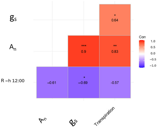 Correlation matrix of the sensor response and physiological parameters measured in the 2019 experiment. gs, stomatal conductance, An leaf photosynthesis, transpiration. * p ≤ 0.05, ** p ≤ 0.01, *** p ≤ 0.001.