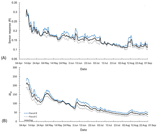 The irrigation season started at the end of May, with a constant daily water supply (of about 7.6 mm) from June to the middle of July that appeared to be sufficient to keep the R signal relatively stable while the ΔIgs continued to decrease. After the middle of June, the daily irrigation supply was reduced to 5 mm, and this resulted in a corresponding decrease in both signals, reaching their minimum in the first week of August (Figure 8A).