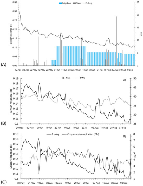Plot of daily sensor response and key environmental traits: (A) rain (gray box) and irrigation (blue box), (B) soil water content (SWC), (C) crop evapotranspiration (ETc). R-Avg, R average; ETc crop evapotranspiration.