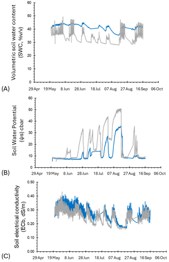 Plots of soil water content traits. (A) Volumetric soil water content (SWC, % v/v), (B) soil water potential (ΨS, cbar), and (C) electrical conductivity, ECb. Blue lines indicate parcel B, and grey lines indicate parcel C. Data represent the average of the two depths of measurements for each parcel.