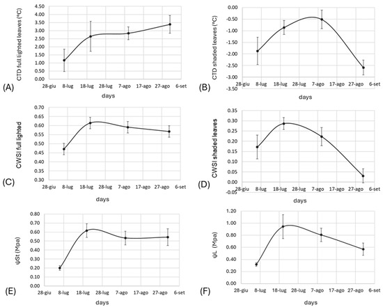 Plots of physiological traits recorded. (A) Canopy temperature depression, CTD, full-lighted leaves; (B) canopy temperature depression, CTD, shaded leaves; (C) crop water stress index, full lighted; (D) crop water stress index, shaded leaves; (E) stem water potential, ΨSt; (F) leaf water potential, ΨL. Data represent the average of the tested plots, standard deviation is shown (n = 3).