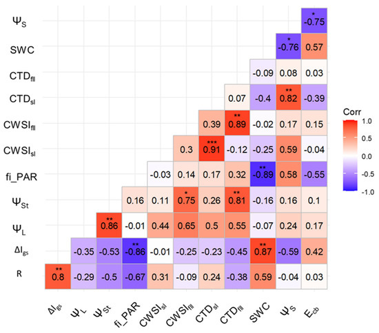 The correlation matrix supported the draw hypothesis, showing a high correlation between ΔIgs, fi_PAR, and SWC, while R showed a good correlation with SWC, although this was not significant (Figure 11). CWSI in kiwifruit does not show a significant correlation with R as previously observed in tomatoes [25].