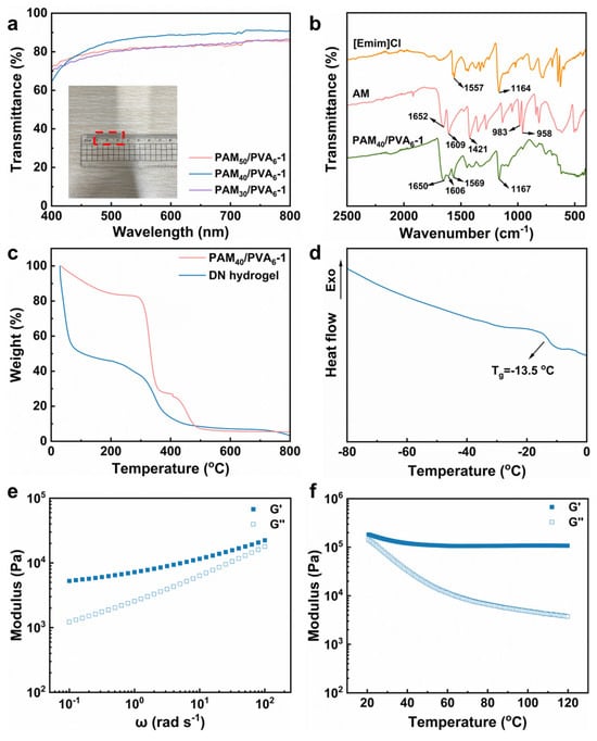 (a) Transmittance spectrum of ionogels with different IL content in the visible wavelength range. Inset: Photograph of PAM40/PVA6−1 placed on a ruler. (b) FT-IR spectra of the [Emim]Cl, AM, and PAM40/PVA6−1. (c) TGA curves of the PAM/PVA DN ionogel and hydrogel. (d) DSC curve of the PAM40/PVA6−1. (e,f) Rheological properties of PAM40/PVA6−1 with the variation in G′ and G″ with angular frequency and temperature.