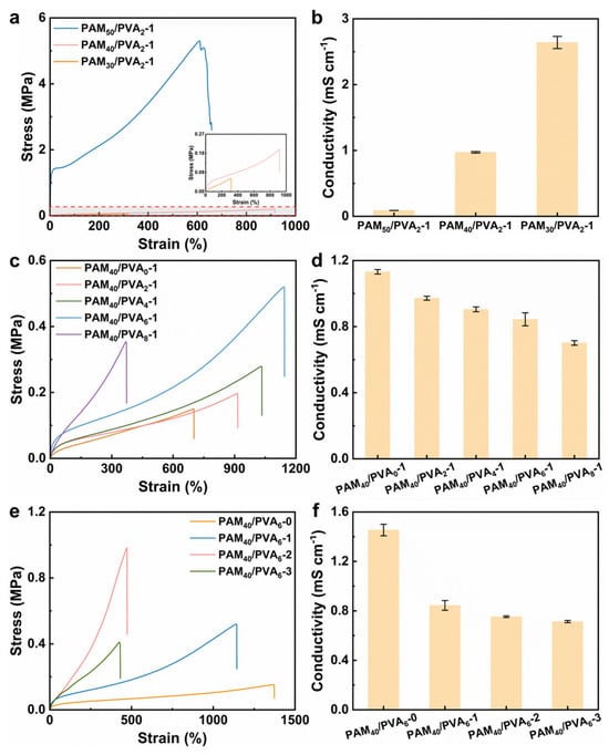 The stress−strain curves and ionic conductivity of the ionogels as a function of (a,b) IL content, (c,d) PVA content, and (e,f) PEGDA content.