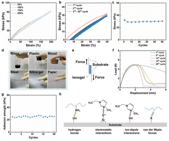 (a) Cyclic tensile testing of ionogels at different strains. (b) Cyclic tensile testing of ionogels at a strain of 50% for 50 cycles. (c) Maximum tensile stress during cyclic tensile testing. (d) Photographs of ionogels adhered to different substrates. (e) Schematic diagram of lap–shear test for ionogels. (f) Typical lap–shear curve of the ionogels. (g) The repeated adhesion strength of the ionogels. (h) The possible interactions between ionogels and substrates.