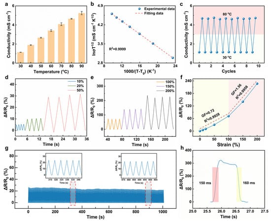 (a) Conductivity of ionogels at different temperatures. (b) VTF plot of conductivity of ionogels. (c) The conductivity of ionogels under alternating temperature changes at 30 °C and 80 °C. (d,e) Resistance changes of ionogels with time at different strains during the loading and unloading process. (f) Resistance changes of ionogels at different tensile strains. (g) Resistance change as a function of time for ionogels with 35% strain within 1000 s. (h) The response time and recovery time of ionogels.