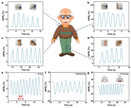 As shown in Figure 5a, the ionogel was applied onto the shoulder, and when the shoulder was lifted at varying angles, distinct strains resulted in different rates of resistance change within the ionogel and consequently yielded diverse output electrical signals. In addition, the ionogel adhered to other articulations of the body can effectively detect joint movements, such as those occurring at the elbow, wrist, and knee (Figure 5b–d). Notably, all recorded electrical signals exhibited excellent repeatability. More importantly, owing to the high sensitivity of the ionogel, it can be utilized not only for monitoring macroscopic joint movements but also for capturing subtle motions. As illustrated in Figure 5e–g, the ionogel has demonstrated its capability in tracking physiological activities such as pulse beats, swallowing actions, and facial expressions like frowning. Figure 5e reveals a pulse beat duration of approximately 0.7 s, falling within the normal range, indicating the potential application of ionogels in health monitoring and telemedicine practices.