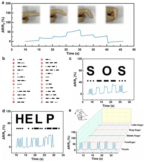 (a) Changes in resistance of ionogels with time during the detection of finger bending and recovery angles. (b) Diagram of Morse code. (c,d) Electrical signals were obtained by ionogels in the process of Morse code communication. (e) Changes in the resistance of ionogels adhered to each finger during sign language detection.
