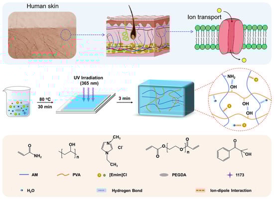 Ionogels: The ionogels are referred to as PAMx/PVAy-z, where x is defined as the mass fraction of AM to AM and IL (wt%), y is defined as the mass ratio of PVA to AM (%), and z is defined as the mass ratio of PEGDA to AM (%). As an example of PAM40/PVA6-1, the preparation process of ionogels was as follows. Firstly, AM (1.6 g), [Emim]Cl (2.4 g), 1173 (0.016 g), PEGDA (0.016 g), and H2O (0.4 g, 1/4 of the AM mass) were mixed and stirred at 80 °C for 20 min. Then, PVA (0.096 g) was added to the above solution, and the stirring was continued for 10 min to form a homogeneous and transparent precursor solution. The precursor solution was transferred into a mold, which was placed between two pieces of glass, and after it was cooled down to room temperature, polymerization was initiated under 365 nm UV light for 3 min to obtain the PAM/PVA DN ionogel.