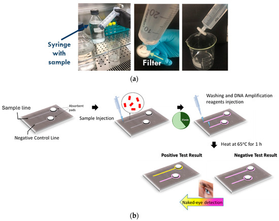 The two-step detection protocol for Legionella included (a) a short (5 min) off-chip filtration step for sample preconcentration, starting from 200 mL of artificially contaminated water, and (b) on-chip bacteria capture, lysis, DNA amplification, and color change (naked eye) end-point detection.
