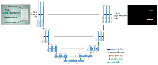 1st step: To achieve the isolation of the detection and control channels, a machine learning model architecture, called U-Net [55], was trained using images from samples analyzed on chip. U-Net is a convolutional neural network architecture developed for image processing and object recognition applications. It consists of an “encoder” and a “decoder” that are combined with a connection bridge. The encoder detects high-level features in the image, while the decoder reconstructs an exact match of the original image. This architecture, shown schematically in Figure 3, is highly efficient for tasks such as the requirement herein, namely the isolation of objects in an image (i.e., the detection and control channels). It must be emphasized that U-net produces a “segmentation map”; i.e., it produces an image with the same dimensions but with active pixels only in the areas of interest (control and detection channels). Therefore, by knowing the positions of the active pixels in the result, we can locate the corresponding positions in the original image.