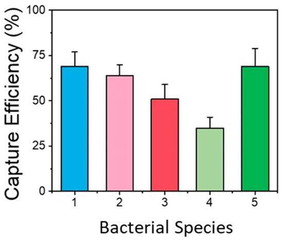 Capturing efficiency of functionalized micro/nanotextured microchannel for different bacteria (1: E. coli, 2: Salmonella, 3: Listeria, 4: B. cereus, 5: L. pneumophila). The results obtained were very repeatable, and all the values were within ±15% of the mean value obtained for each bacterial species.