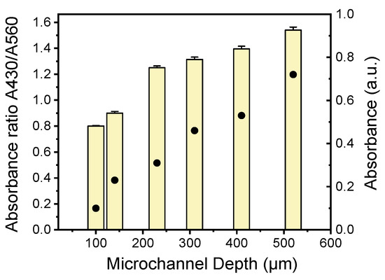 Absorbance (dots) and absorbance ratio (bars) of A430 to A560 nm of LAMP-amplified Legionella DNA in PMMA microchannels of various depths.