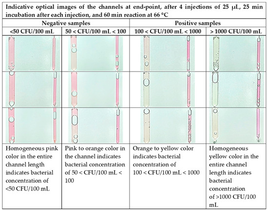 In addition to the color code (Figure 8) for semiquantitative results based on end-point color detection, a computational image analysis was also developed. From the HSV-based methodology, we conclude the following: (1) the samples with different concentrations are numerically separated based on the hue color value; (2) the positive and negative samples are separated clearly; (3) the positive samples with concentrations in the range of 100–1000 CFU/100 mL and greater than 1000 CFU/100 mL are well separated; and (4) the negative samples show hue color values very close to the negative control ones. The chip operation as it was presented in this work is intended for semiquantitative (POS/NEG, based on a color code and computational image analysis) water sample analysis. However, quantitative analysis is also possible through the same computational methodology, considering the quantification of the color change as a function of time during the amplification of different L. pneumophila sample concentrations and of the negative control channels. Such computational work is currently in progress.