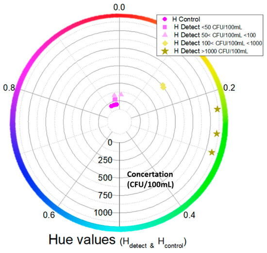 Circular graph of hue values for positive and negative (sample) channels as well as negative control channels vs. bacterial concentrations (from 0 to >1000 CFU/100 mL). Each color and shape (apart from the negative control channel) represent a different concentration (indicated by the concentric circle scale).