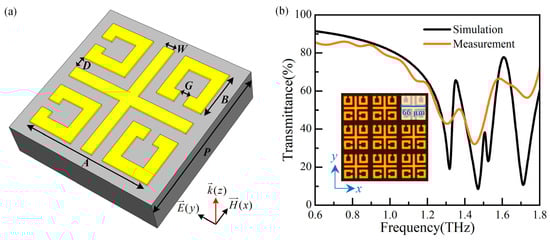 A high-sensitivity sensor based on MMs is proposed, which consists of four split-ring resonators (SRRs) arranged asymmetrically and a cross, as presented in Figure 1a. The coupling capacitance is increased by using the gap of SRRs and between SRRs and the cross, resulting in improved sensitivity [10]. The metal structure is gold with an electric conductivity of 4.561 × 107 S/m and a thickness of 0.2 μm. The substrate is quartz (lossy) with a dielectric constant ɛr = 3.75 and a thickness of 1000 μm. The geometrical parameters are P = 80 μm, A = 66 μm, B = 24 μm, D = 6 μm, W = 6 μm, and G = 5 μm. Numerical simulations are carried out using CST Microwave Studio (2016). The periodic boundary condition of the unit cell is applied in the x- and y-directions and open (add space) in the z-direction. Electric and magnetic boundary conditions are adopted along y- and x-directions to simulate the Ey-polarized incident waves propagating along the z-direction. The sensor is fabricated using MEMS processing technology, and the photograph of the physical device is shown in the insert of Figure 1b.