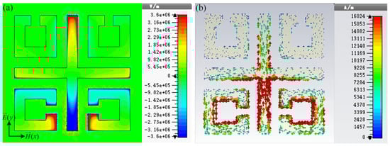 (a) Normal electric field and (b) surface current distributions of the sensor at 1.32 THz.