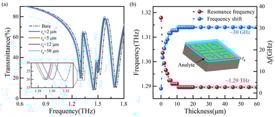 Sensitivity is analyzed to assess the sensor’s performance accurately. The analyte is placed on the top of the MMs sensor, as shown in Figure 4b insets. The thickness (ta) and dielectric constant (ɛa) of the analyte affect the local electric field of the MMs sensor. In the case of determining the geometric dimensions of MMs, the effective dielectric constant (εeff) is proportional to εa. Any change in εa directly affects the sensor’s resonance frequency shift. ɛa can be obtained by the square of the refractive index (na). Therefore, we focus on the influence of ta and na on the sensor’s simulated transmission spectrum of the sensor.