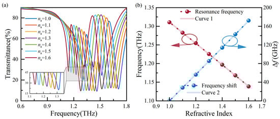 Subsequently, the influence of the na on the sensor’s sensitivity is analyzed. For the analyte’s thickness of 50 μm, a simulation is conducted with na ranging from 1.0 to 1.6, resulting in the transmission spectra shown in Figure 5a. As na increases, a redshift in the resonance frequency is observed. The resonance frequency and ∆f, corresponding to the refractive index, are extracted and plotted in Figure 5b. Linear fitting curves, denoted as Curve 1 and Curve 2, are obtained by performing linear regression analysis on the resonance frequency and ∆f, respectively. Curve 1 is described by the equation f(na) = −0.287 × na + 1.599, and the theoretical sensitivity (S) is 0.287 THz/RIU.