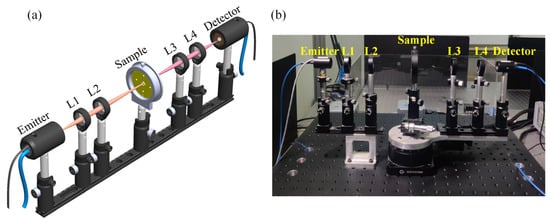 As shown in Figure 6, THz-TDS is used to analyze adherent cells in a biosensor chip with a typical spectral resolution of ~30 GHz [16,17]. The schematic diagram shows two photoconductive antennas (PCA), one emitter and the other detector, four lenses (L1, L2, L3, and L4), and a sample. A femtosecond laser (FemtoFErb FD 6.5, Toptica company, Gräfelfing, Germany) with a wavelength of 1550 nm, a power of 80 mW, a pulse duration of 60 fs, and a repetition rate of 100 MHz [18] drives the PCA, which generates photogenerated carriers that accelerate under the bias voltage and radiate electromagnetic waves in the THz band [19]. By using lens 1 (L1; focal length f1 = 50 mm), the divergent horizontally polarized THz beam is converted into a collimated beam and then focused on the sample through lens 2 (L2, focal length f2 = 100 mm) to obtain a beam with sample information. Subsequently, the beam becomes a collimated beam through lens 3 (L3; focal length f3 = 100 mm) and then passes through lens 4 (L4; focal length f4 = 50 mm) to the detector antenna. Finally, by scanning the delay line and using phase-lock amplification technology, the detection antenna transforms the THz beam into a current signal, realizing the detection of the terahertz electric field vector.