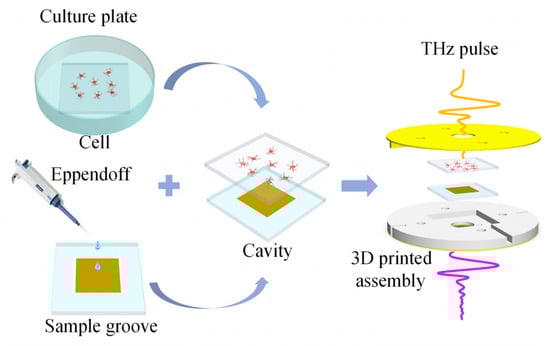 The quartz glass plates with adherent cells are taken out of the six-well culture plates and washed twice in PBS to remove any excess organic matter that might affect the test results. The cleaned sample groove is positioned horizontally, and PBS is added to the sample groove with the MMs sensor to maintain the liquid environment required for cell viability. The quartz glass plates with the adherent cells are placed on top of the liquid sample groove, with the side of the adherent cells facing the liquid groove. Through the combined effects of atmospheric pressure and water surface adhesion, the glasses with liquid are tightly attached to form an ultra-thin liquid cavity [15]. This method can combine a high-sensitivity sensor with adherent cells in a liquid environment, offering numerous advantages. It enhances sensitivity, weakens the water’s strong absorption of THz waves, ensures uniform sample thickness, and closely mimics the in vivo state of the measured cells. Next, the chip with living cells is placed in a 3D-printed assembly to apply additional pressure for enhanced chip stability, followed by mounting this assembly onto an optical bracket (LM2, THORLABS, Newtown, America) used for THz-TDS. The steps for assembling the sample are illustrated in Figure 7. Finally, the obtained time-domain data are transformed by Fourier transform to obtain the frequency domain signal, and the frequency signal with the sample information is normalized by the reference signal to obtain the sample transmission spectrum. The reference chip consisted of three pieces of double-sided polished quartz glass, and unlike the biosensor chip, the metamaterial structure is replaced with a glass plate. The reference signal is obtained by the reference chip with PBS.