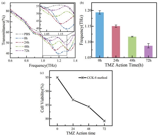 Measurement results of glioma cells with TMZ action time: (a) the transmission spectra of the biosensor chip, (b) error bars of the resonance frequency of the biosensor, and (c) the cell viability of the CCK-8.