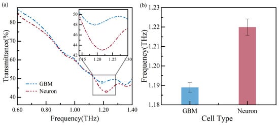 Using THz spectroscopy, glioma cells and neurons are cultured to verify the biosensor’s ability to distinguish between different types of cells at a concentration of ~5200 cells/cm2. The measurement results are shown in Figure 9, and the circle maker corresponds to the local minima in Figure 9a. The figure displays the frequency shift between glioma cells and neurons. The glioma cell’s and neuron’s resonance frequency shifts to 1.19 THz and 1.22 THz, respectively, with a resonance frequency difference of ~30 GHz. The resonance frequencies are measured multiple times and plotted in Figure 9b, showing the measurement error is less than 0.35%. The resonance frequency of glioma cells is lower than that of neurons, indicating that glioma cells have a significantly higher refractive index than neurons. This finding is consistent with previous reports [23,24,25,26,27]. Based on the above analysis of results, our measured results suggest that the glioma cells and neurons can be distinguished at a concentration of ~5200 cells/cm2.