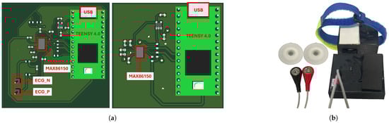 The system consists of two devices. The first captures the ECG signal in the patient’s chest and the PPG signal in the index finger of the hands. The second device records the PPG signal at the hallux. The devices were designed using a MAX86150 module from Analog Devices [] and a Teensy 4.0 development board from PJRC [] to acquire the signals. The design of the devices is described below.