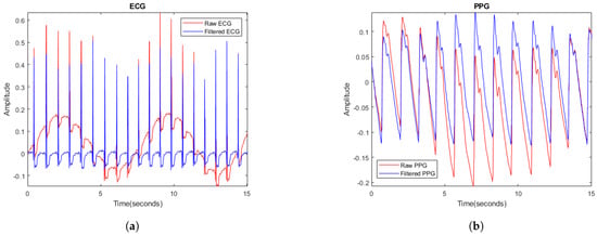 (a) Raw ECG signal in red and filtered signal in blue; (b) raw PPG signal in red and filtered signal in blue.