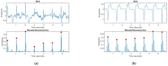 For the ECG signal, a four-level decomposition was performed using the fourth-order wavelet of the Symlets family ‘sym4’, which is characterized by its similarity to the QRS complex, making it an ideal choice for R-peak detection []. In the wavelet transform, the information contained in the high frequencies is analyzed with greater precision at a smaller scale, while it is focused on the low frequencies at a larger scale. In this context, the results of the detail coefficients 2 and 4 of the decomposition are used. Coefficient 2 contains high-frequency information that allows us to identify the QRS complex and emphasize the R-peak of the signal. On the other hand, coefficient 4 contains low-frequency information, which in some cases facilitates the representation of P- and T-waves in the ECG signal. This reconstruction procedure makes it possible to characterize the signals obtained in people with a weak pulse, where it may be difficult to recognize the R-peak, or in cases where the ECG derivation obtained represents the QRS complex negatively. Figure 4a shows the original signal, characterized by significant variation and noise that make it difficult to identify the components of the ECG signal, together with the result of the reconstruction using the wavelet transform. Figure 4b shows another signal with the QRS complex in the negative, together with the result of the processing performed. The points highlighted in red indicate the identified R-peaks.