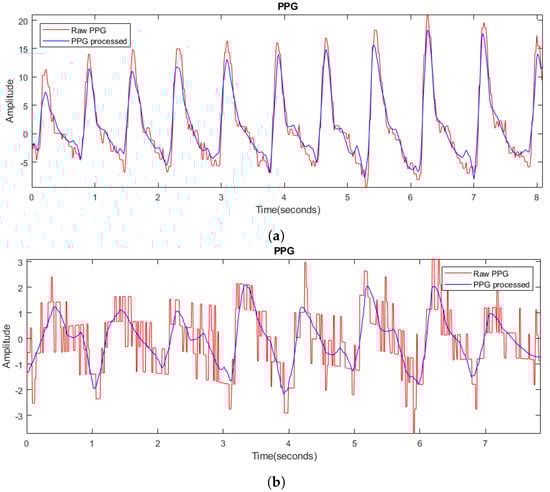 Figure 5a shows the initial result of the PPG signal processing, highlighted in red, together with the reconstructed signal, highlighted in blue. An improvement in signal clarity is observed, which facilitates identification of the systolic contraction point. On the other hand, Figure 5b shows an initial signal with significant noise, highlighted in red, but the reconstruction result clearly describes the original signal, being clear and of sufficient quality for further analysis. These two extreme cases illustrate the ability of the processing to improve the quality of the signal from a clean initial signal to one with a high level of noise. This processing is different from traditional smoothing techniques, which are based on a smoothing factor that can vary from case to case, making it difficult to adapt the algorithm to different situations and not guaranteeing effective signal denoising.