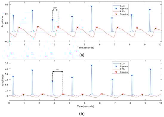 Because the ECG and PPG signals are acquired simultaneously, the PTT parameter can be determined as the time difference between the S-point on the PPG and the preceding R-peak on the ECG. Therefore,  and  are defined as the pulse transit time from when the blood leaves the heart to when it is reflected in the fingers and toes of the hand, respectively. Figure 6 shows the result of processing an ECG signal in blue and PPG in red, together with an example of the result of identifying R- and S-points, the latter measured on both the hand and foot. In addition, the graphs illustrate the  and  parameters.