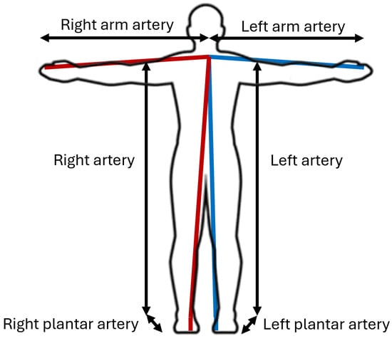To calculate the total distance from the heart to the hallux of each foot, it is necessary to sum the lengths of the right () and left () arteries together with the measurement of the plantar artery (). Consequently, the parameters  and  are defined to characterize these combined distances.