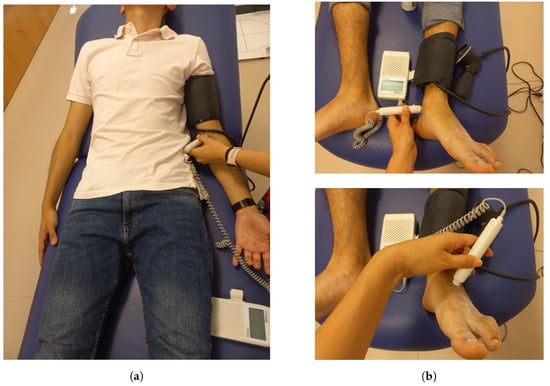The ABI measurement procedure by vascular exploration was performed by medical personnel specialized in podiatry. It was performed using a sphygmomanometer with pressure cuff and a Bidop V3 vascular Doppler device. The patient was placed in the supine decubitus position, and the pressure cuff was placed above the elbow flexion point to locate the brachial artery. The Doppler equipment was then turned on, and SBP was recorded based on the sounds generated across the artery due to pressure changes. The same procedure was repeated on both ankles, with the cuffed sphygmomanometer placed over the malleoli and SBP measured over the pedal artery at the instep and posterior tibial artery behind the ankle. Figure 8 shows an example of the device setup and arterial locations.